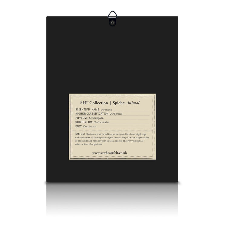 Hundreds of tiny glass beads and intricate layers of sequins applied with tremendous skill...and patience...map out the colours and patterns of the super shiny spider. Padded from behind this forms the plum domed body of the creature. It is then mounted in a box frame with a fun archivist Latin description denoting the genus of the beastie!
