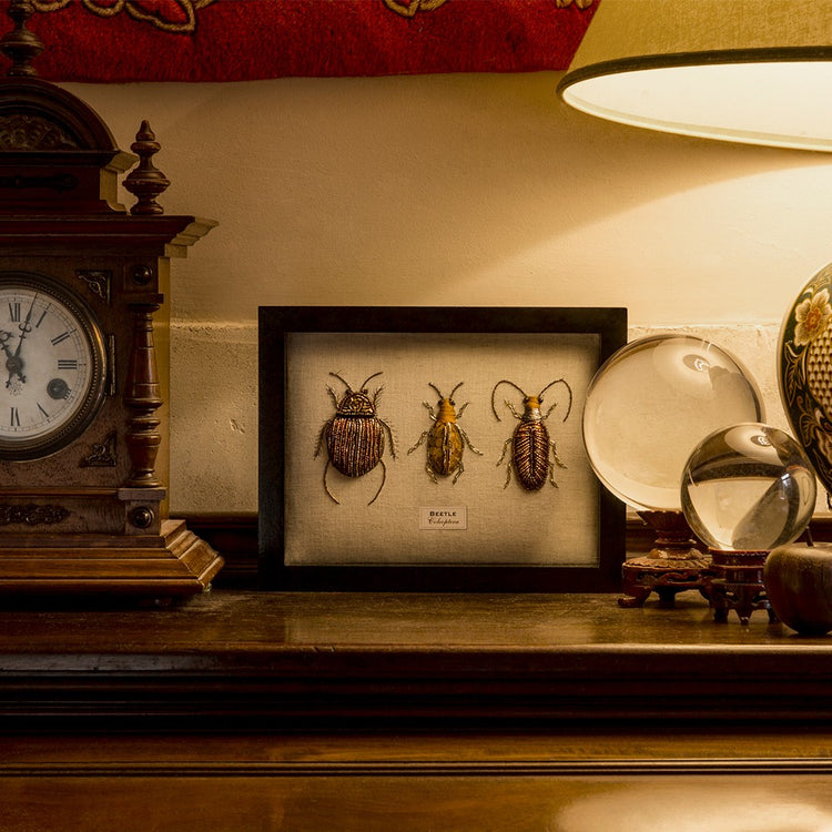 Hundreds of tiny glass beads and intricate layers of sequins applied with tremendous skill...and patience...map out the colours and patterns of these three bettles. Padded from behind this forms the buzzy body and it is mounted in a box frame with an archivist Latin description denoting the genus of the beastie on the reverse!