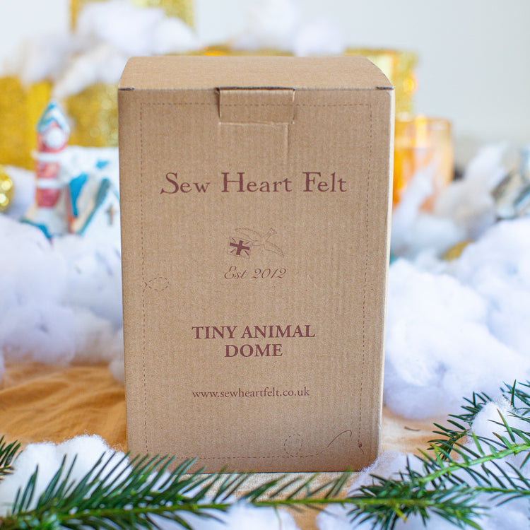 Our domes have been hand crafted in glass with tiny, shiny gold stitch line all the way around, smart Sew Heart Felt logo on the front and a sweet glass heart on the top which is really pretty but also means you can lift it up and down with ease to display your favourite Tiny Animal!