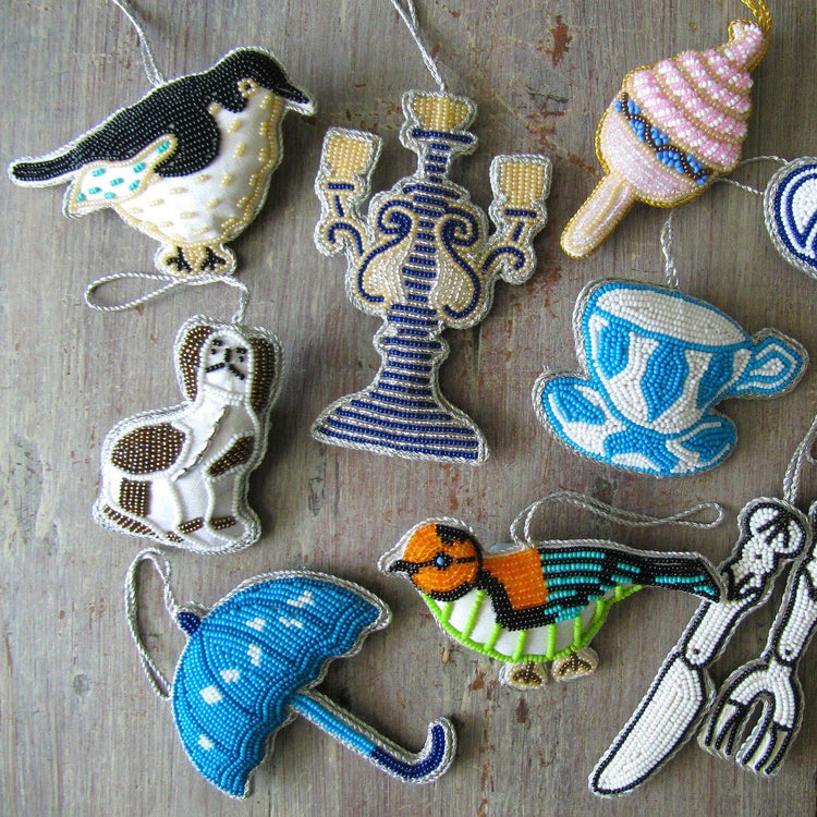Skilfully hand beaded Christmas decorations are made by sewing delicate pretty fine glass beads onto coloured silk material. These lovely decorations are the perfect addition to any traditional Christmas tree!